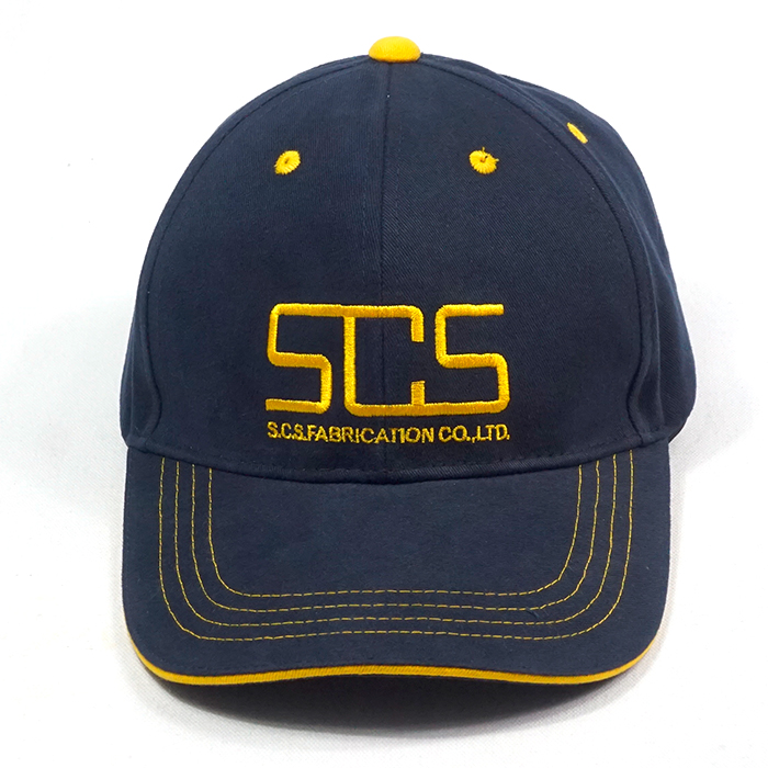 แบบหมวกแก๊ปสีล้วนผลิตตามแบบของลูกค้า ตัวหมวกสีกรมท่า เพิ่มลูกเล่นให้โดดเด่นด้วยแซนวิสและเย็บวนปีกหมวก บวกกับสีรูระบายอากาศและกระดุมหมวก และปักโลโก้เป็นสีเหลืองตัดกับสีตัวหมวกได้เป็นอย่างดี ทำให้หมวกดุโดดเด่นสะดุดตาเป็นอย่างมาก เหมาะที่สั่งทำเพื่อนำไปแจกจ่ายในงานต่างๆ
